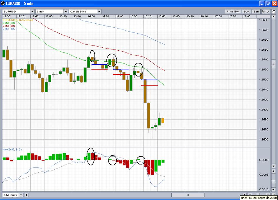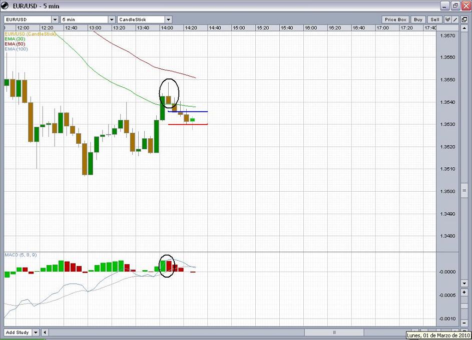 Mira este trade del 24-02-10, en el vemos al precio rebotando en la EMA(30) y luego una vela roja que quiebra esa vela, la cual viene acompañada por la señal del MACD abajo... tenemos un setup. Colocamos nuestra orden de venta en el siguiente nivel que es el 1.3575, la siguiente vela nos toca la orden y estamos dentro... sin embargo el precio no despega, se queda ahi en esa zona subiendo y vajando... Mira específicamente la vela que te marco, esa vela sube y supera el 1.3580, si hubiéramos tenido nuestro SL en -5 pips nos habría sacado ademas que en -5 tiene muy poco sentido porque mira el ultimo máximo donde se ubica, mas allá del 1.3585... PERO igual fijemos la atención en el hecho de que el precio nunca cierra por encima del pivote que marca la vela de señal y que el histograma del MACD permanece rojo en todo momento... Incluso la vela que te marco es una pinbar... Luego de todos estos movimientos fake el precio cae muy rápidamente pagando nuestro trade. Esa es la idea...