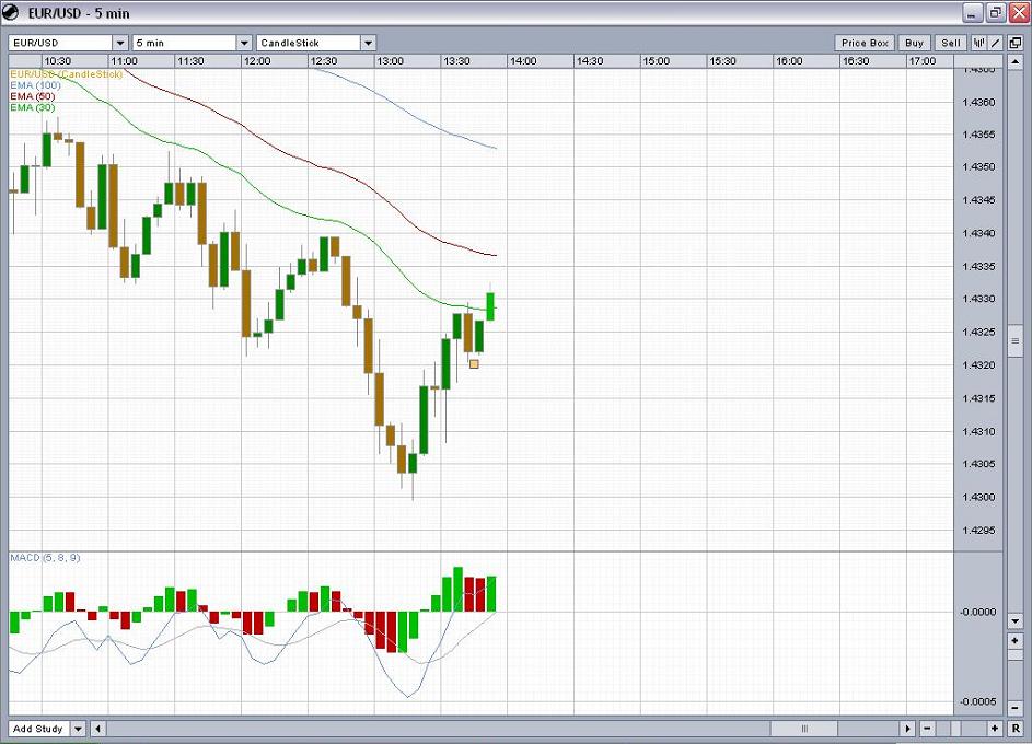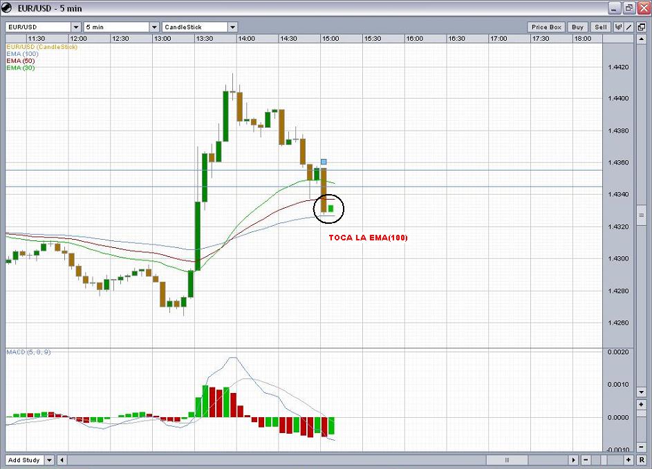 PaulAllen escribió:...Te cuelgo el balance de las operaciones de hoy. 4 operiacions 3 bien y una cerrada. Aparte realice una operación sobre las 2 GMT que no me salio bien y perdí el SL, por que aún no tenia conocimiento del cambio del SL. Lo probé con otros pares con spreads bajos de Oanda, especialmente con USD/JPY y me a dado malos resultados.  Excelente PaulAllen felicidades por esos pips!! Veo que tienes oportunidad de operar las dos sesiones... eso es bueno, yo por aquí en Costa Rica estoy durmiendo durante la sesión Europea así que solo trabajo en la Americana. Yo tambien le hice tests en USDJPY y vi que no serve, ese para teinde a tener retrocesos más profundos por lo que no son las condiciones que buscamos para esta estrategia. Bueno, posteo el trade de ayer jueves aproximadamente a las 14:05 GMT. Notemos en este primer gráfico que se da la señal, yo coloco la orden de venta en el nivel 1.4320 (el cuadrito amarillo) pero el precio se da vuelta y el retroceso alcista sube un poco más... Yo cancelo la órden cuando el histograma se vuelve a poner verde... ( NOTA: cuando digo que el histograma se vuelve a poner verde no me refiero mientras la vela está en desarrollo, sino cuando esta cierra) Luego nos da una nueva señal de venta en una pequeña vela de indecisión así que colocamos la orden en 1.4330... +5 pips!!  Hoy viernes veindo el desarrollo del NFP, tuvimos una señal de compra alrededor de las 14:55 pero el precio siguió su bajada y no llego a tocar nuestra orden de compra (el cuadrito celeste)... Aprovecho para comentar un detalle de la estrategia... Como hemos descrito en las reglas, buscamos un rebote en la zona Z30-50, en el gráfico anterior vemos al precio testeando la EMA(100). Una señal desde esa ema no es válida para mi y no tomaría un eventual trade. Solo si el precio subiera, volviera a hacer un retroceso bajista hasta Z30-50 y diera señal pensaría en tomar el trade. Bueno creo que con esto ponemos fin a la semana, los resultados son: Trades Ganados = 6 Trades Perdidos = 0 Ganancia/Pérdida = +5,42% Excelente semana!! Pura Vida!!