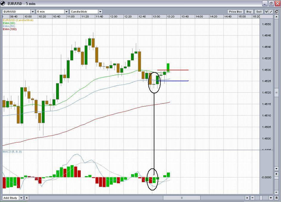 OK... 1 trade hoy, nos pagó justo porque luego se dio vuelta cayo como 15 pips...  Si fue un poco arriesgado, más que el gráfico de 1H ya nos marcaba el inicio de una potencial reversa bajista. En el primer gráfico vemos que el precio nos da señal, colocamos la orden de compra en 1.4530 pero el precio se da vuelta sin abrir la operación y cierra por debajo del patrón y nos cambia el histograma a rojo de nuevo... cancelo la órden. En el segundo gráfico volvemos a tener señal desde la EMA(50)... Compra en 1.4525 a las 13:05 GMT... +5 pips Si se fijan, hubo una señal de trade un poco más temprano como a las 12:15 GMT que resultó buena también, sin embargo yo me encontraba en proceso de levantarme de la cama... Pura Vida!!