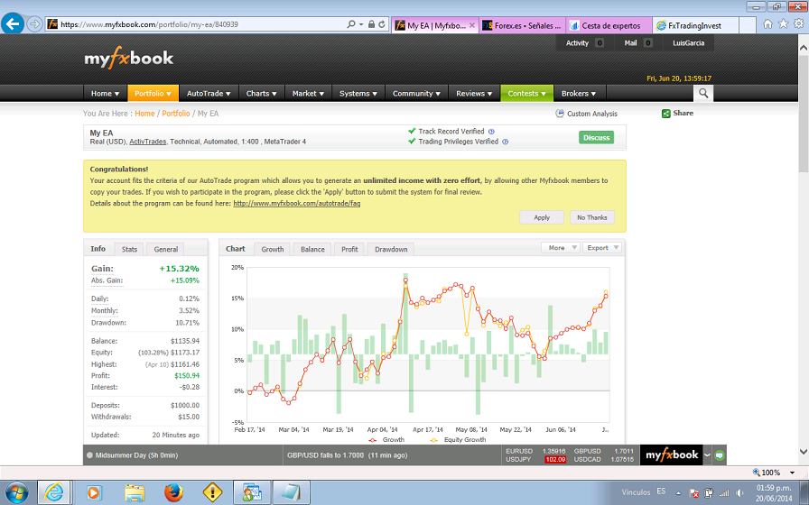 Yo sólo por aclarar, diré que LuisG no ha recibido insultos de mi parte aunque he discrepado en cuanto a la efectividad de las señales. Es más, le dije que si algún día era rentable con señales o robots de terceros me alegraría por el. Por oto lado y sin ánimo de ofender, la cuenta esa de "Vale Todo" tiene la fecha editada ( This account uses a custom start date - for full history analysis use the "Custom Analysis" tool. ) y si nos vamos a la fecha real de inicio (18-11-13) podemos ver que ya fue reventada en diciembre del 2013, así que pienso que es osado que digas que actualmente eres rentable llevando tan sólo 3 meses con un DD del 60% y habiendo reventado esta misma cuenta anteriormente al nuevo depósito de fondos.  Sobre la Demo que has abierto de autotrade, tú mismo dijiste esto sobre las señales de MyFxBook: LuisG escribió:Al menos los de myfxbook no me resultan rentables, tengo como 5 demos y ninguno gana.