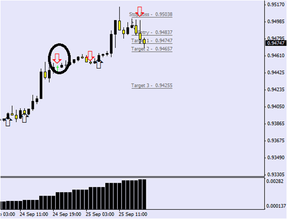 Vease por ejemplo la señal anterior a la que indicas... la flecha negra que indicaría compra, e incluso en las tres señales de compras que salen en la foto (las tres flechas negras) si hubiéramos ido apilando entradas al final nos hubiéramos llevado un buen pico... Cerrando por señal contraria (cuando sale una flecha roja) Unos 95 pips aprox arriezgando muy poco en cada operacion “No sirve para nada proclamar la verdad en economía o recomendar cosas útiles. Es la mejor manera de hacerse enemigos” A. Kostolany