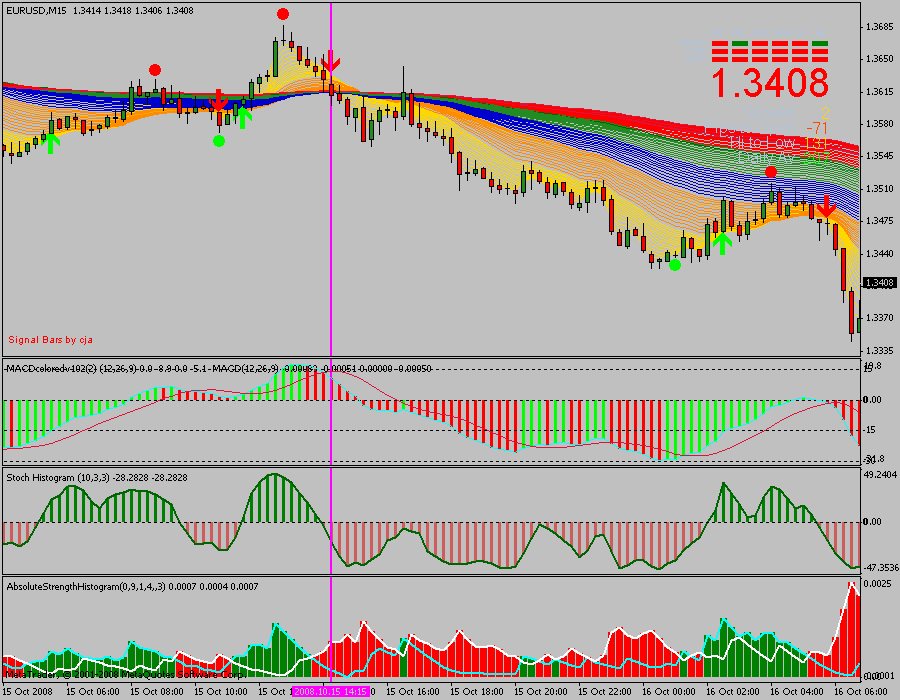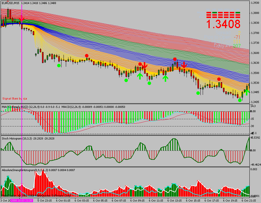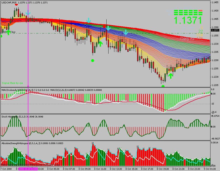 Hola ninpojutsu, en realidad me parece un excelente sistema solo hay que pulir ciertas cosas para poder visualisar mejor aqui te muestro una imagen con una mejor forma de visualisacion permite ver bien las velas y las señales mejor espero tu repuesta gracias 1. Amarillo - a corto plazo los comerciantes (sobre todo para ir rápido y no pips interesados en la celebración de posiciones) 2. Naranja - los comerciantes a corto plazo (Los mantener las posiciones un poco más largo que el de color amarillo) 3. Azul - medio plazo los comerciantes (principalmente comerciantes swing, por lo general mantener las posiciones ya que los anteriores 2) 4. Verde - largo plazo, los comerciantes (sobre celebrará sus posiciones a más de medio y corto plazo, los comerciantes) 5. Rojo - largo plazo, los comerciantes o los inversores (que se aferran a su posición la más larga) att worldteam