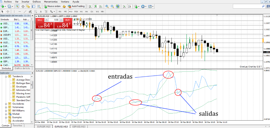 Spread sintético en la ventana principal o...Hola a todos,¿se podría poner un spread sintético en la ventana principal,con todas sus funciones?Me explico crear un spread sintético(eje EURUSD/GBPUSD) la entrada sería manual,pero la salida y el stop me gustaría dejarlo puesto...pero no se como porque si un par se mueve más que otro,no puedo.Pongo lo de ventana principal,pero me vale la misma del indicador,la operación sería,entro en la parte de arriba de la banda de bollinguer y salgo en la media.Gracias por vuestro tiempo,pongo un gráfico,porque es lioso de explicar ,pero fácil de ver.