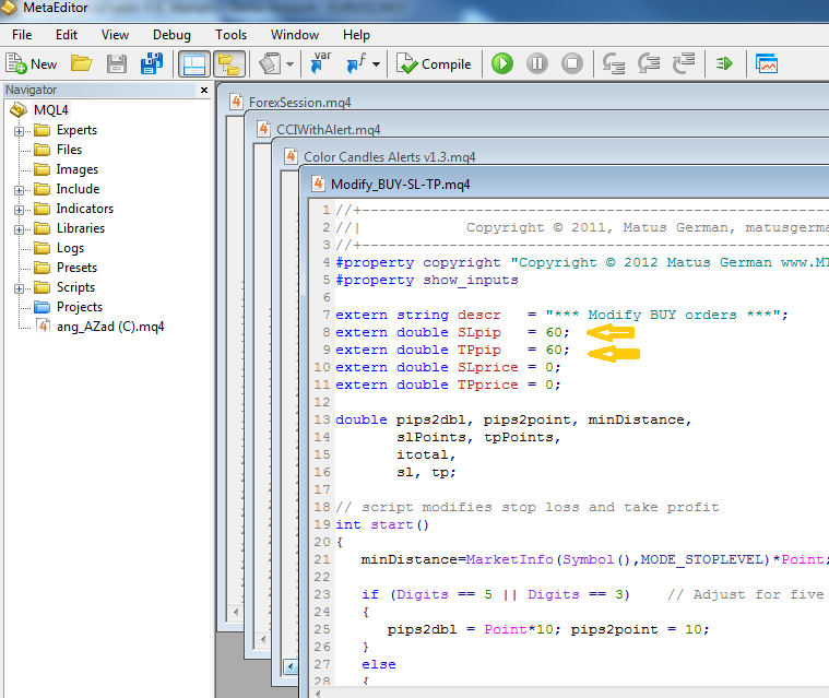 Para ponerlo en la pantalla es sino dar click en los scripts y lo arrastras a la pantalla, si es compra arrastras compra o buy, y lo mismo con sell. Son dos scripts, 1 para buy o compra y otro para sell o venta. Modifica la raíz de los 2 scripts a los pips que quieras dando click derecho al script buy o venta y en modificar das click y te abre el código y donde dice slpip pones el numero de pips que quieras. debes dar click en compile. (mirar imagen). Lo mismo con el script sell o venta. Esto ya no es necesario, leer el mensaje siguiente. Última edición por Akita11 el 28 Mar 2014, 00:45, editado 2 veces en total