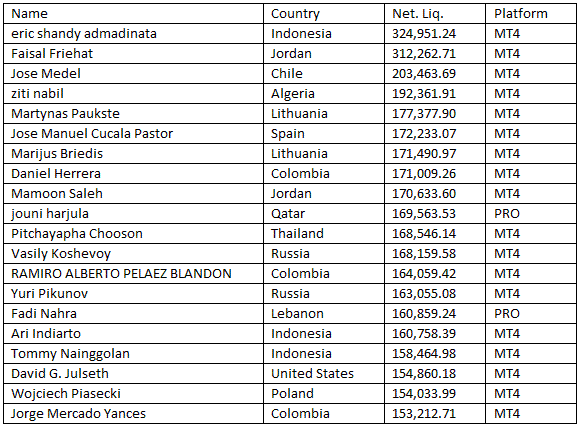 En resumen el dia 30 pero ya se hizo lo necesario. Tien el ultimo top 20? Les cuento que el concurso cumplio mis espectativas personales, con tres objetivos fundamentales 1. Poner la demo rentable. 2. Destacarme entre los mejores 3. Estar en el top 10 Estos tres se cumplieron. Pero falle porque no fui el mejor y no pude duplicar la cuenta. Saludos a todos los concursantes.