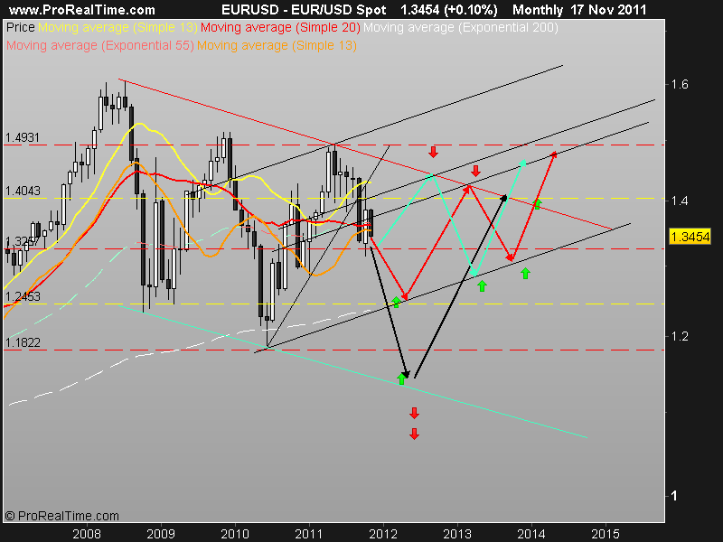 este grafico ilustra la economia mundial ,,un grafico mensual es la economia a largo plazo ,,para los que dicen que con un grafico no se puede predecir la economia ,,pues si y es asi ,,esta es mi vision del asunto ,,EUR USD esta lateral por eso en los TF mas pequenios el reflejo es de indecision ahunque yo tengo un filtro que muy pocas veces falla que en FOREX se da muy poco y esta vez se dio por eso mi sentimiento es bajista ,,,,las flechas son los diferentes escenarios y con recorridos diferentes todos van a dar al mismo lugar ,,, esa es mi prediccion ,,puede hacer cualsquiera de las cosas que ahy les pongo ,,en todo caso el patron es alcista ,,,una bandera asi como se ve ahy es alcista ,,cosa que inevitablemente pasara y asi mis acciones se van al cielo espero que a principios del proximo año ,,,pienso que las flechas rojas es lo que va a ocurrir por que para mi tiene mas logica con los acontesimientos actuales mundiales como las elecciones en USA en Nov del 2012 y demas ,,,los ciclos presidenciales son muy importantes y tanto este par como el NYSE para mi estan bien arriba en esa fecha FOLLOW THE MONEY