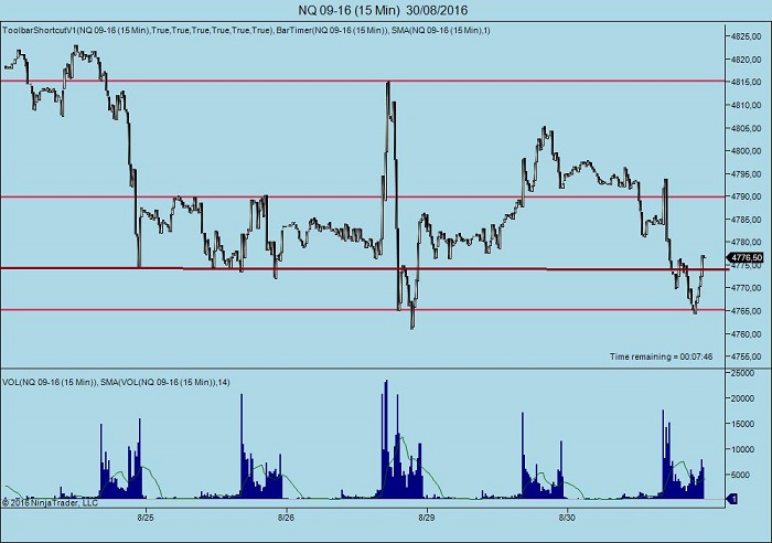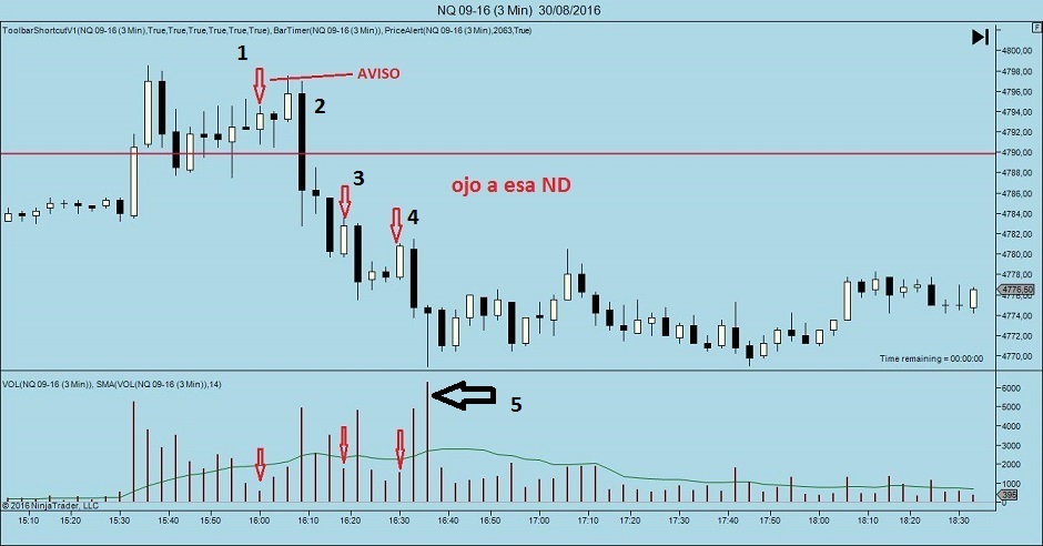 Y es que al haber caída en pared, la volatilidad que se presentó fue extrema. Las posibles entradas, se me escapaban de mi stop máximo. Y en la arrancada del primer tramo bajista, sencillamente tuve bloqueo de tecla, y no le di. En cualquier caso, no quiero convertir tampoco el hilo en un "Diario" de mi operativa, aunque lógicamente si me apoyaré en ella para hablar del precio y el volumen. Volviendo a los gráficos, si en 15min tenía ya la idea "casi clara" de la opción bajista, y en 3min...¿dónde entrar? ¿Qué iba sucediendo?: 1- Ese aviso que señalo en el chart. Intenta subir, pero no hay gasolina. 2- Velón negro cortando el nivel de los 4790, se confirma la caída. 3- Oportunidad de libro. El volumen de es vela es inferior al de las dos precedentes. COMO MARCAN LOS CÁNONES DEL VSA. 4- Oportunidad escondida. Como comenté, intentaré explicar bajo mi criterio, cosas que no son como pone en los libros. Esa no sería una No Demanda de libro, porque el volumen no es inferior al de las dos precedentes, tal y como pasaba en la anterior, la del punto 3. Pero siempre tiene que prevalecer el sentido común. El volumen es relativo. Hay que compararlo con lo que tenemos detrás. Si el precio vienen en tendencia bajista, y los picos de volumen altos son cuándo el precio viene cayendo...Esa vela de retroceso, alcista, ¿Creéis que con ese volumen va a girar al precio?. No hay demanda. 5- Se acabó la fiesta, entraron las compras. No tiene por que girarse ahí ( de hecho no se giro, buscó el 4765) , pero ahí ha entrado el profesional con compras, corto ya no es. Un saludo, "El conocimiento sólo se posee si se comparte"