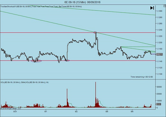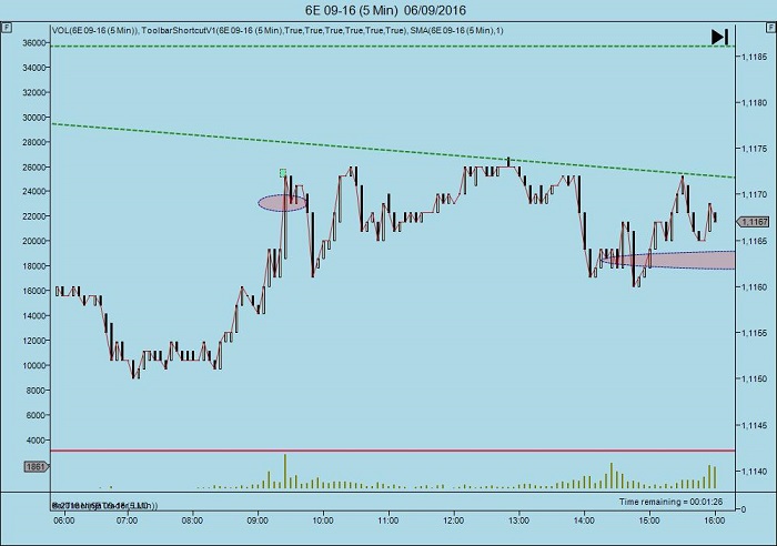 Re: Una Mirada al Precio y al VolumenLa sesión del pasado día 6 de Septiembre, en el futuro del euro, me pareció interesante para ver una acumulación y posterior cruce desde un soporte, a una resistencia. Apoyados como tantas veces, en las noticias.