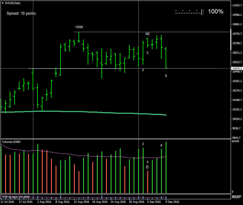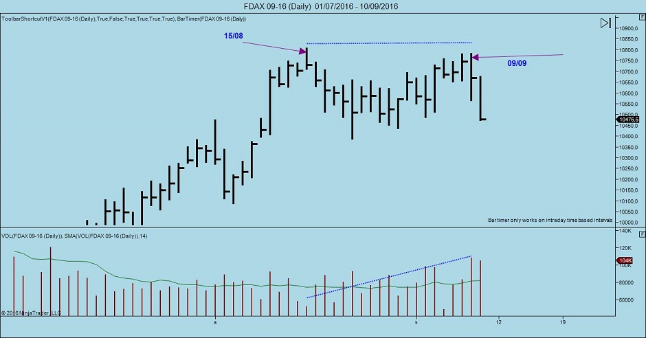 El dia 2 de septiembre se forma una barra diaria reversal con buen volumen y cierre en maximos. Parece que la demanda a tomado el mando, pero al dia siguiente, dia 5, no hay continuidad. Yo le veo doble interpretacion a ese dia, o bien la demanda está agotada (ND), y esta es incapaz de darle continuidad a la barra anterior, o bien pudiera ser un test exitoso de bajo volumen. Me decanto mas por la primera opción, ya que estamos en un techo de mercado, cerca de una resistencia. El dia 6 tenemos una doji. Hay cierto volumen por lo que tanto oferta como demanda estan en equilibrio e igualadas. Dia 7 veo una barra bastante alcista. La demanda se ha esforzado en cerrar en la parte alta de la barra, después de un intento inicial de los vendedores de bajar el precio, pero el cierre de ese dia apenas está ligeramente por encima del maximo del dia 2. Por tanto, parece que el esfuerzo de la demanda no ha tenido mucha recompensa. El dia 8. El precio no puede superar el maximo del dia 7 y se forma un doble techo por debajo del techo anterior del dia. El precio cae pero al final la demanda se resiste y la barra cierra en la mitad del rango diario. Y lo peor, el precio no consigue superar el maximo del dia 15 de agosto. Se podría considerar un doble techo con este dia. Ayer viernes dia nueve claramente la demanda ha sucumbido y la oferta tiene claramente el control, con lo que espero nuevas caidas en los dias sucesivos. Primero tendrá que romper el soporte pero tal como se ve la barra es probable que lo haga. Este es un grafico diario del futuro del dax de prorealtime con volumen real, para comparar el volumen real con el tick volume Como se puede apreciar, el analisis del volumen con este grafico sería el mismo que con el del tick volumen que yo he hecho. Al fin y al cabo, volumen y tick volumen, los dos miden la actividad del mercado. Lo que no me cuadra es el cierre de la barra del ultimo dia, dia 9. ¿Como se ve en otras plataformas? Saludos