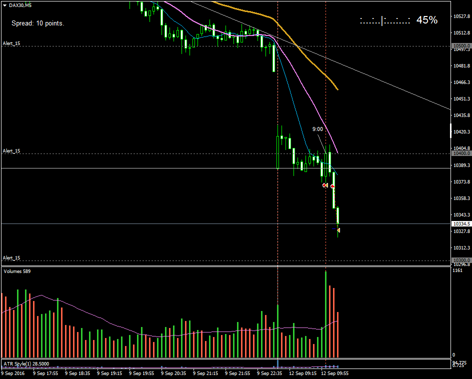 Tal como se anunciaba, la debilidad se ha hecho patente y el mercado a abierto con un gap bajista que al momento que escribo no se ha cerrado, y pudiera ser que no se cierre. En la apertura de Franfurt el precio a hecho intentos de ruptura del minimo de la primera barra pero sin decisión. De todos modos en este tramo de sesión, antes de Londres, no hay mucho volumen que posteriormente pueda hacer mover el precio con la volatilidad para dar un movimiento interesante. En la vela justo antes de las 9:00 hora local de España (Apertura de Londres), junto con la vela de las 9:00 formaron lo que se llama reversal upthrust, llamado tambien por otros como spring. Pero un spring que al fin y al cabo es un falso Breakdown, en una tendencia fuertemente bajista, tiene muchas probabilidades de fallar. Y falló el fallo, valga el juego de palabras. Y debajo del minimo de la vela de las 9:00, estaba yo esperando el fallo del fallo y con un TP ajustado a la volatilidad, es decir, equivalente a dos veces el ATR 20. Todo salió perfecto con una ganancia de 41 puntos. Saludos.