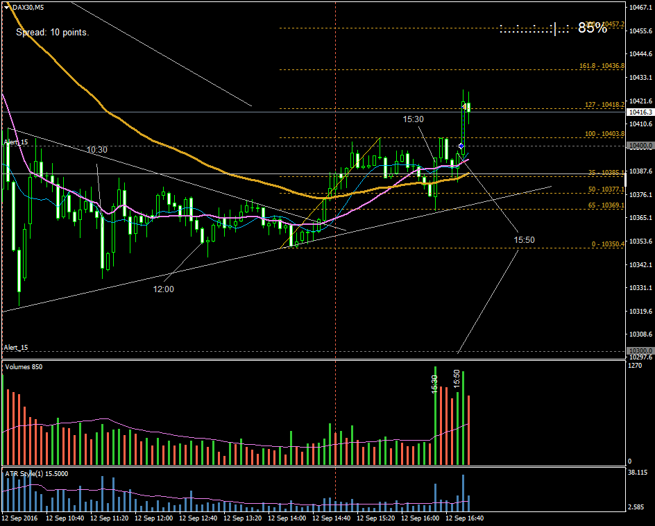 Re: Una Mirada al Precio y al VolumenEsta tarde me he quedado en el ordenador haciendo otras cosas, pero con el grafico abierto. No tenía intención de operar pero a las 15:30 aparecio una barra alcista que al final fue de 4,5 veces el volumen de la barra anterior. Claramente ahí estaban actuando los profesionales. Vela envolvente alcista de rango amplio y cierre en maximos. Me parecia demasiado evidente y no quise entrar por que ademas habia un techo y un numero redondo muy cerca. La siguiente vela, la de las 15:35 con bastante volumen tambien, menor rango y cerrando en maximos pero haciendo un doble techo. La vela de las 15:40 hay un reversal, pero resulta ser un retroceso de dos velas. Ninguna de las dos velas bajistas es de bajo volumen, así que no hay test. La vela de las 15:50 resulta ser una envolvente alcista que cierra por encima del maximo de la ultima vela bajista. Me decido a entrar con un objetivo modesto pero realista con la volatilidad. Se alcanza el objetivo.