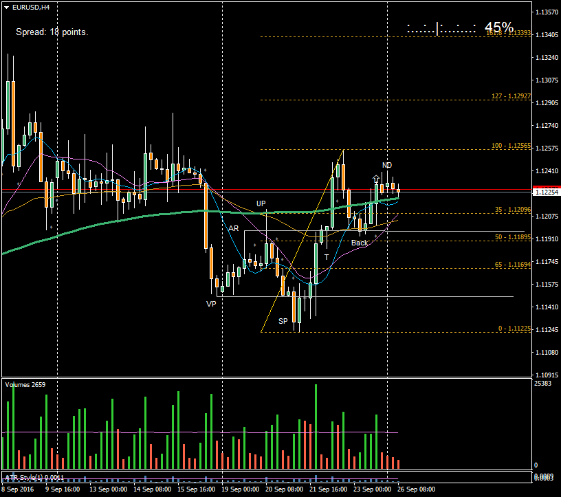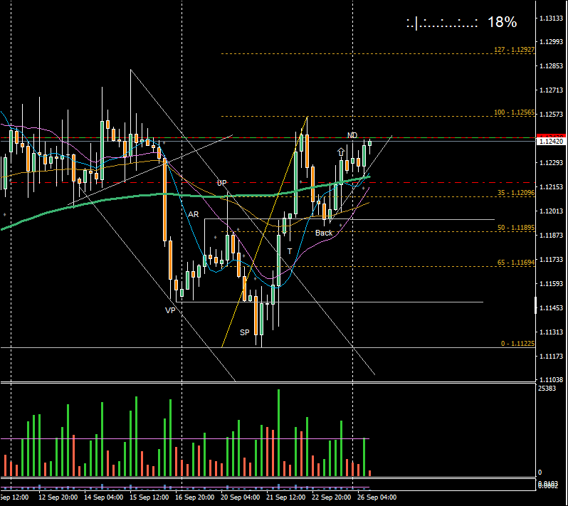 Primero venimo de una caida que termina con un volumen de parada (VP). Luego, según la terminologia Wyckoff viene el rally automatico, automatic rally (AR) con bajo volumen, que sirve para trazar la linea superior de un rango de trading. Se forma un Upthrus que le sigue nueva caida, y lo que algunos podrian llamar patrón 2B, y para el trader Wyckoff es un Spring. El precio sube, y en el mismo "salto del arroyo" se produce un test positivo que ayuda para pasar el arroyo con decisión. Back al antiguo soporte con bajo volumen y vela gatillo para largos. Lo vi el viernes pero no quise colocar la orden de compra por que era viernes por la tarde y no me apetecia tener una orden puesta el fin de semana. Despues de la vela de disparo, se produjeron tres velas con no demanda (ND). Y ahora estoy esperando que la vela actual cierre de alguna manera que me convenza para colocar mi orden de compra. Veremos que pasa. Saludos.