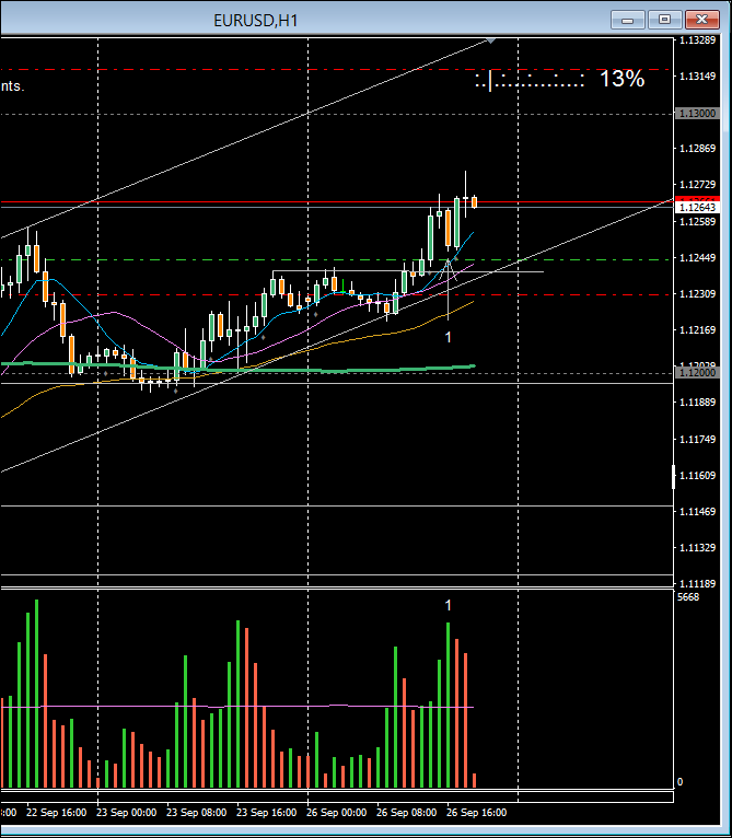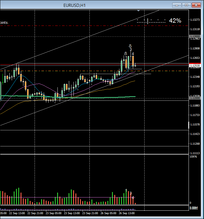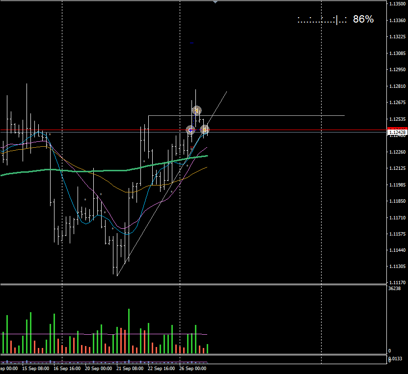 Ahora viene la mejor. La gestión de la operacion: cuando salir, o tomar parciales o incluso piramidar ( esto ya es mas dificil). Mirando el gráfico de una hora tenemos la vela 1 bajista con un volumen muy fuerte. El mas fuerte en muchas velas. Es un notable esfuerzo que no ha conseguido tumbar al precio pero quizás lo haya herido de muerte. En la vela 3, el doji, la oferta ha seguido presionando. Tu que opinas de esto corcha. ¿Qúe significado tiene esto para tí? ¿Abría que tomar alguna medida? ¿Quizas tomar algún parcial? Un saludo.