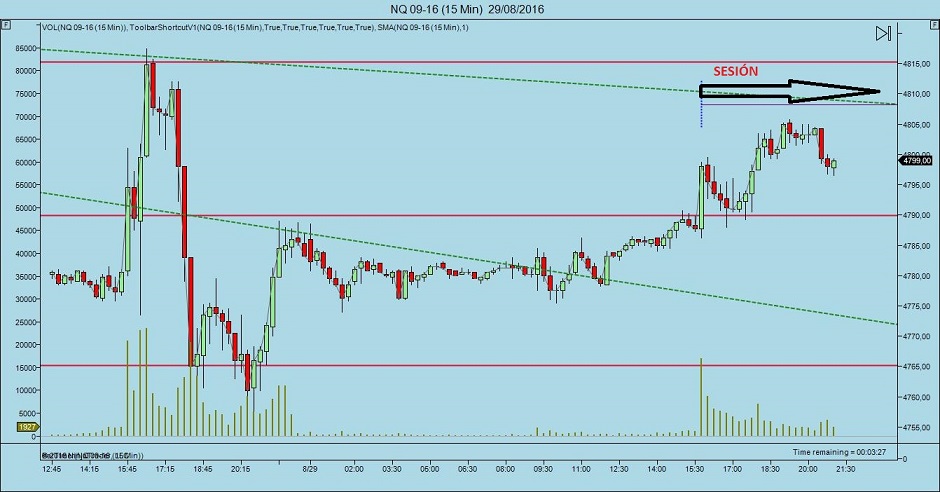 Pues bien, más o menos el NQ ayer cumplió uno de los planes, que era el de buscar la direztriz bajista superior. Como tenía ya mi plan y la idea clara, en cuánto vi el impulso alcista, esperé a la correción con volumen bajo, y saqué mi trade.