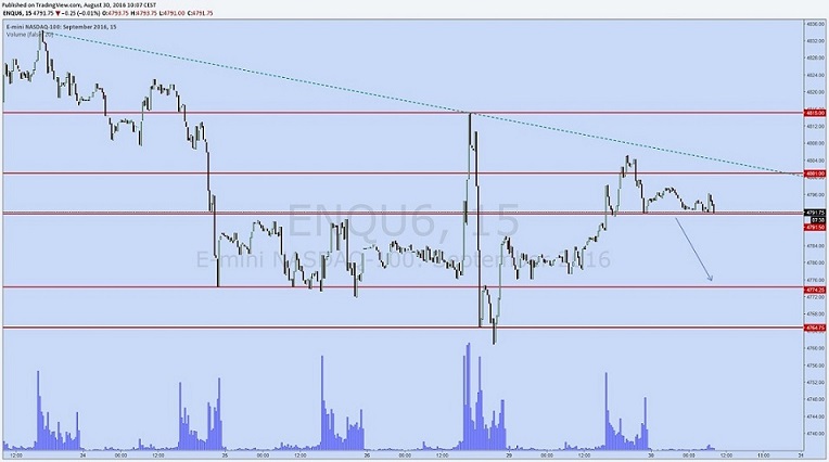 corcha escribió:Ya vamos al grano, Actualmente, y después de años con el futuro del mini sp, estoy operando el futuro del Nasdaq. ¿Por qué?. Tan solo puedo operar desde las 15:30 a las 17h horario España. en esa hora y media el mini apenas me daba un oportunidad, cosa que me hace perder la paciencia, soy inversor agresivo. Pues me puse a buscar. Ente el Dow y el Nasdaq dudé. Al final el NQ da más amplitud de movimientos. También es más peligroso. Mi operativa es ahora muy escalper, pillo un poquito y me voy. Utilizo espacios temporales de 15, 3 y 1min, y si hay mucha volatilidad como el viernes, tengo que bajar a 30sg. Plan de trading para las 15:30. Ese es el aspecto que presenta el NQ a las 12:50. Tiro los soportes y resistencias. Fijaros como he marcado las zonas dónde el volumen fue ultra alto. El precio ahora mismo parece querer subir hasta el 4793, que además sería confluencia con el Fibo 62, que no he dibujado. Si pasa ese nives podría buscar la directriz bajista superior. El escenario bajista sería llegar al 4764.50 (yo hasta ahí ni operaría) y ver que hace en ese nivel. Si lo pierde , pues para abajo. Si recupera, posiblemente se quede en lateral. Veremos pues.