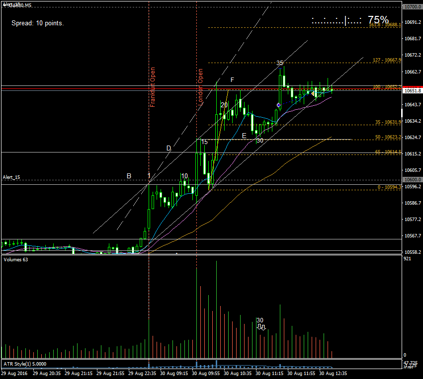 Después de venir de desayunar, me encontré desarroyandose la vela 29. Al cierré lo que ví fue una vela sobre la linea de soporte digamos menor, linea E con compras por debajo del soporte. La siguientes dos velas, 30 y 31, a pesar de cerrar en sus maximos y por encima de los cierres anteriores lo hicieron con muy bajo volumen, por lo que lo interpreto como falta de demanda. La vela 32 aumento la demanda y fué una inside bar. La siguiente fue una doji, pero la vela 34 fue una muy buena vela de señal de rango mas amplio y cierre en maximos. Entrada larga. En la vela 35 se acaba el fuelle. La 36 es una vela bajista con alto volumen. El precio empieza a caer sin llegar a tocar mi stop situado en breakeven, pero las vela con mechas superiores me dicen que no hay demanda, por lo que cierro mi posicion con pocos puntos ya que el mercado no quiere dar mas. Y con esto y un bizcocho...