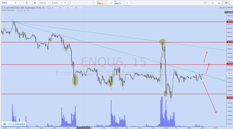 Actualmente, y después de años con el futuro del mini sp, estoy operando el futuro del Nasdaq. ¿Por qué?. Tan solo puedo operar desde las 15:30 a las 17h horario España. en esa hora y media el mini apenas me daba un oportunidad, cosa que me hace perder la paciencia, soy inversor agresivo. Pues me puse a buscar. Ente el Dow y el Nasdaq dudé. Al final el NQ da más amplitud de movimientos. También es más peligroso. Mi operativa es ahora muy escalper, pillo un poquito y me voy. Utilizo espacios temporales de 15, 3 y 1min, y si hay mucha volatilidad como el viernes, tengo que bajar a 30sg. Plan de trading para las 15:30. Ese es el aspecto que presenta el NQ a las 12:50. Tiro los soportes y resistencias. Fijaros como he marcado las zonas dónde el volumen fue ultra alto. El precio ahora mismo parece querer subir hasta el 4793, que además sería confluencia con el Fibo 62, que no he dibujado. Si pasa ese nives podría buscar la directriz bajista superior. El escenario bajista sería llegar al 4764.50 (yo hasta ahí ni operaría) y ver que hace en ese nivel. Si lo pierde , pues para abajo. Si recupera, posiblemente se quede en lateral. Veremos pues. "El conocimiento sólo se posee si se comparte"