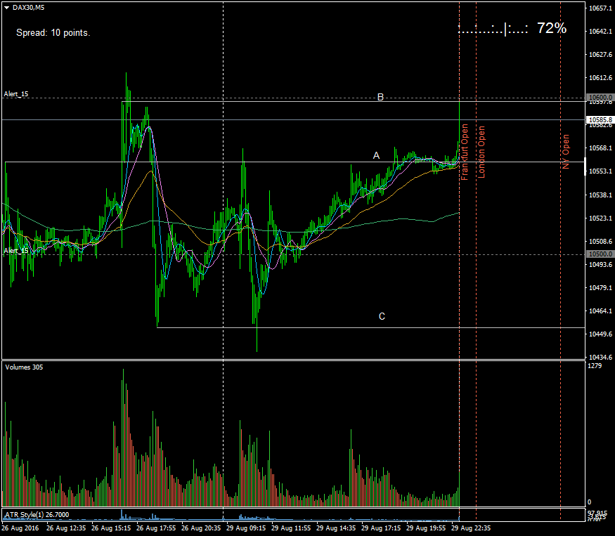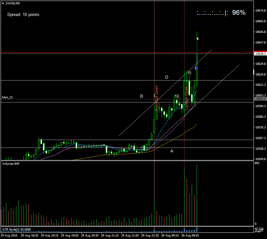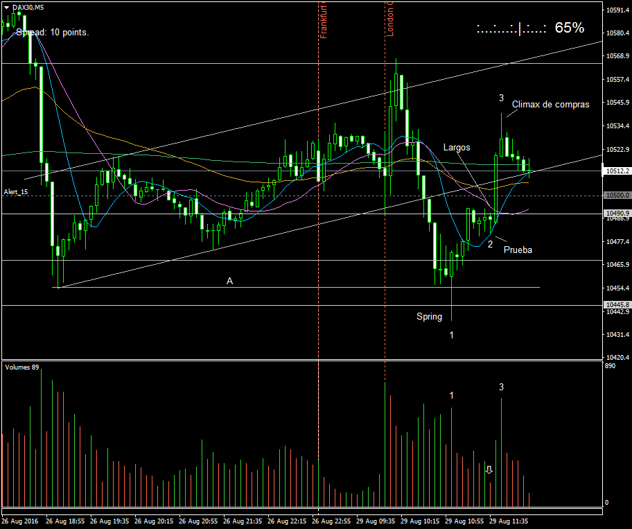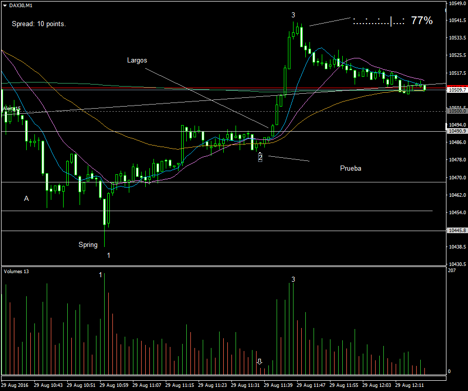 Re: Una Mirada al Precio y al VolumenHola. Yo en cambio opero por las mañanas en el dax. Normalmente lo hago de 9 a 11 o 12, aunque suelo estar entre las 8 y 8:30 para controlar el mercado. Hoy he hecho una operación bastante buena recien la apertura de Londres, pero no es eso lo que voy a comentar, creo que lo que vino después fue mas interesante.