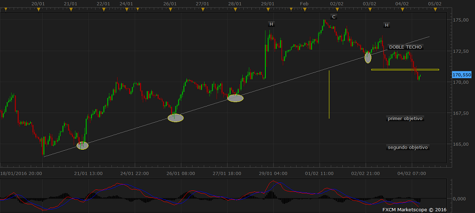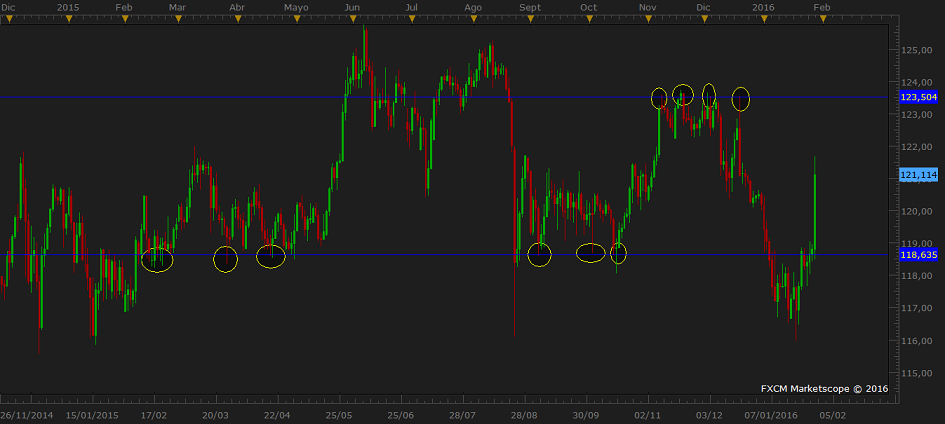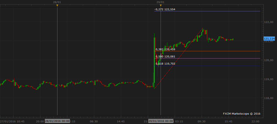 Parece que la operacion te ha salido rana... SI pones una media de 200 simple en graficos de un dia, veras que: - El spike es por los intereses negativos de los japos... en su afan por devaluar moneda... pero vas a darsela a los EEUU... - EL Spike llega a la media de 200, por la parte abajo... logico pensar que pueda ser un "simple" pull back de 200 y pico pips... - Precio psicologico 121.500, antiguas zonas de soporte/resistencia + mitad de rango entre maximo/minimo de mas de un año, entre 116 y 126... - EN graficos pequeños de 5 min veo pautas de agotamiento + precio por debajo de la media paulatinamente + mi MACD, marcando divergencias+ rotura de linea de tendencia alcista entre minimos de 5 min.... Yo me puse corto... ....Hablamos