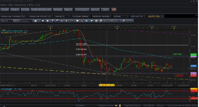 ANALISIS TECNICO: 1.GENERAL: -Comprar en 90,625, con TP en 90,780 y SL a ver en l mometo de la compra. -Vender en 89,684, con TP y SL a ver en el momento de la venta. 2.EXPLICACION: En los gráficos de 1H vemos que la tendencia es claramente bajista, pero parece que hay sintomas de freno en la gráfica de 30 min. Esto creo que es debido porque en la gráfica de 5min se ha formado un "canal rectangulo" cuyo techo esta rebotando en un nivel de fibonacci trazado en 15min y el mínimo de de las gráficas de 1h, 30min y 15min(tambien 5min). Si se rompiese este canal por arriba pienso que se iria al siguiente nivel de fibonacci para rebotar. Si lo que se rompe es el suelo del canal, seguiria teniendo un descenso fuerte. El T.Profit en este caso lo pondria igual a la altura de la bandera formada(osea altura del canal) y el SL lo pondria a la mitad del TP para que hubiese una relación 1:2 (dos análisis errados equivale a uno ganado por lo que si acertamos en la mitad de los casos obtenemos ganancias). El SL en verdad habría que ponerlo por encima del rectangulo, pero una vez entrado claramente dentro del rectangulo mi análisis ya hubiese fallado, ya que si rompe por debajo debe tener una tendencia bajista clara. Hay que tener en cuenta también que no es exacto la medida de ganancia de pips porque la venta se realizaria despues de cumplirse la rotura hacia abajo y no justamente en la rotura(para estar seguro) y el stop limits podria ponerse o en relacion 1:2 o en la mitad del canal. Yo lo pondre en 1:2. Es decir, si se ganase la operación seria unos pocos pips menos que la "altura". 3.PASOS: Los pasos va a ser siempre igual. Ver gráficas de 1H, 30MIN, 15MIN(mi gráfica principal) y 5MIN. En todas estas gráficas buscaremos los máximos y mínimos y la tendencia. Para gráficas de 1H, lineas lilas(o moradas¿?). Para gráficas de 30MIN, lineas amarillas. Para gráficas de 15MIN, lineas grises y para gráficas de 5MIN lineas discontinuas rosas. Despues de haber realizado esto he agregado además fibonacci en la gráfica de 15MIN para ver el retroceso de la tendencia bajista. CAMBIOS: ANALISIS FUNDAMENTAL: RESULTADO: PREGUNTAS Y DUDAS: ¿Alguién sabe como colocar una orden OCO para que si saltase la opción de compra por ejemplo, la opción de venta se anulase y además hubiese otras opciones OCO que sirviesen como stop loss y limit de esta compra? Supongo que se podra hacer en ordenes de OCO complejas, pero no se como.