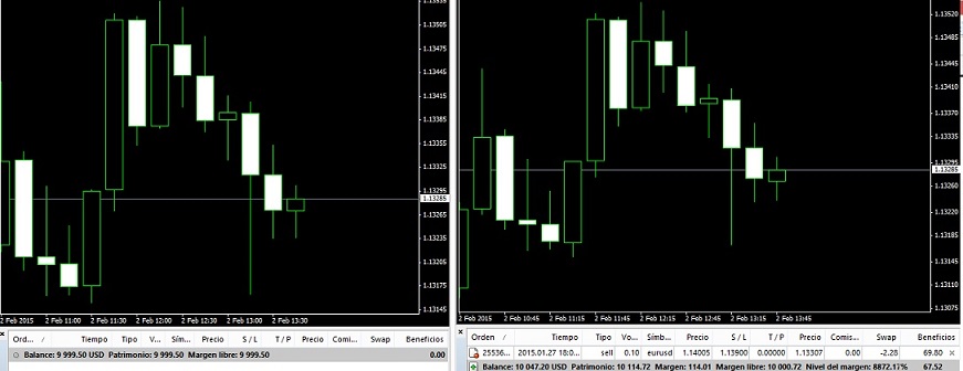 Buen día a todos, continuando con nuestras pruebas , la situación esta así ninguno ha abierto mas operaciones, pues no ha habido señal. el bróker M esta con 1.8% ( sin embargo debe tener un poco menos púes el precio subió y eso es de una venta que esta abierta). bróker F sigue en ceros