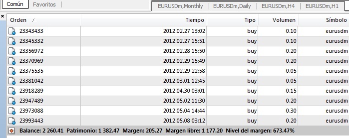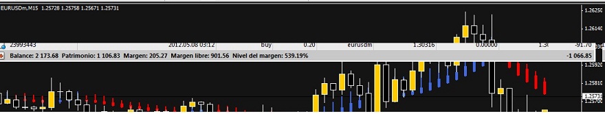 bueno comparto contigo algo y aclaro que lo que comentas se debe tener en cuenta, "no me convence mucho que uno se maneje sin SL". es algo que hago pero NO LO RECOMIENDO, si no se usa un margen como el mio o de tamaño similar,mis lotes son muy bajos pero aun asi, puede fundirme la cuenta. hice esta prueba en real, asumiendo el riesgo del caso y tratando obviamente de sacar la ventaja del caso en igual manera. esperaba inicialmente pasar la cuenta a 1500 usd, ahora la idea es ponerla en 5000 usd, pero en 1 AÑO, ojo es un año o algo mas. como veran voy perdiendo un montonon de pips, pero aun asi segun mis cuentas aguantaria hasta 1.18 en Eur/Usd. de hecho pase 100 usd de esta cuenta a otra para darle mas fortaleza a la otra. En este momento especulo que pasaran 2 cosas, precio en 1.18 o precio en 1.40, 1.18 = cuenta fundida 1.40= cuenta por encima de 5000 usd. recuerden es 1 año. no me crucifiquen por todo esos pips en contra, jeje. ese es mi operativa. Un abrazo a todos, ahi les pego la imagen,