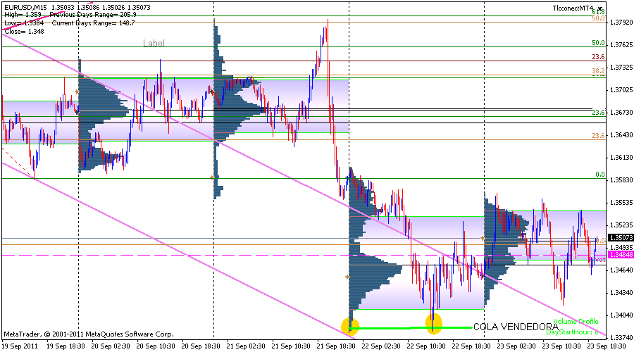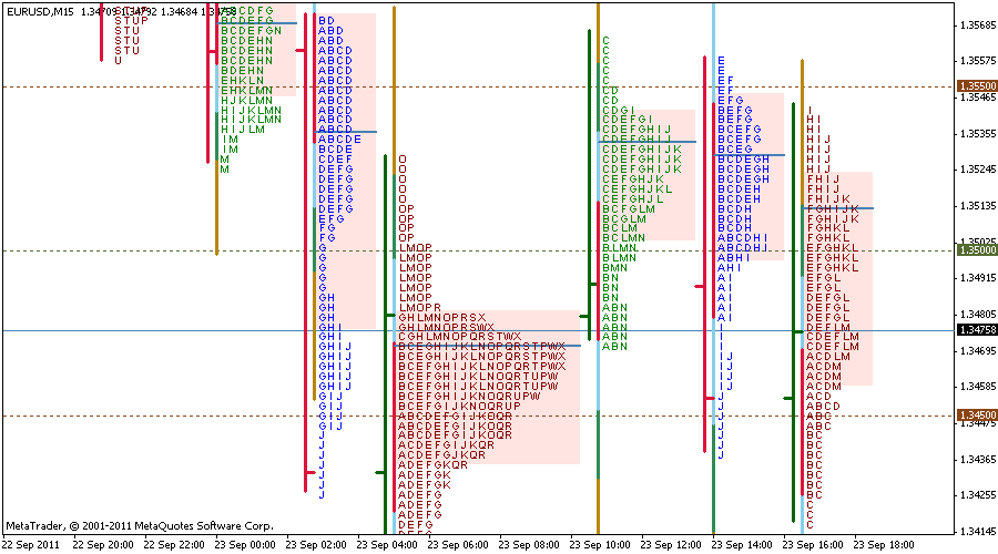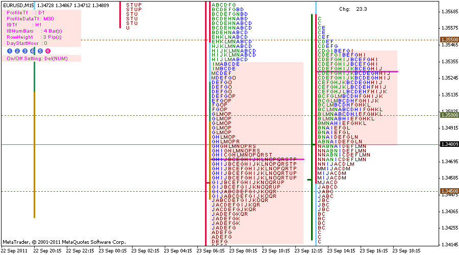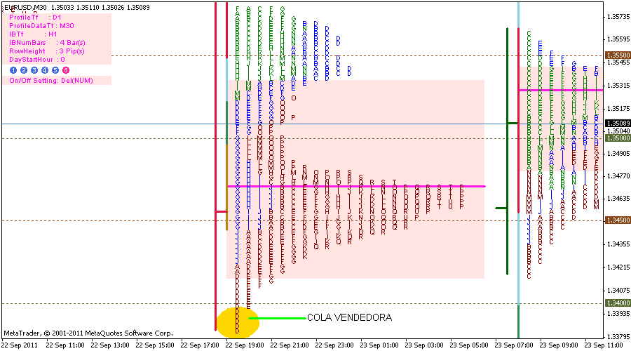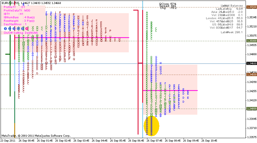 Aqui vemos como siempre el eje X (tiempo) y el eje Y (precio), el histograma del MP esta configurado para que inicie a las 0:00 horas (GMT + 1), resulta que los momentos de maxima volatilidad en forex son durante los solapamientos de las sesiones: (Tengo un gran lio con los horarios, peor creo que se debe configurar asi. - Londres & Nueva York [12:00 - 16:00] GMT ( Americana 12:00 h) - Tokio & Londres [07:00 - 09:00] GMT (Europea 7:00 h) - Sidney & Tokio [00:00 - 06:00] GMT (Asiatica 0:00 h) (datos proporcionados por forexpros)Mi broker Alpari ofrece los precios en GMT +1, por tanto ajusto esto en el indi. Solo he testeado esto en la apertura europea, es la que mas me gusta, las demas ya lo miraré. Es comlicado deducir cuando iniciamos el profile porque el mercado es continuo, pero bueno, es lo que hay. Yo por observacion he visto que a partir de las 7:00 h GMT empieza haber movimiento, por tanto inicio el profile a esa hora.