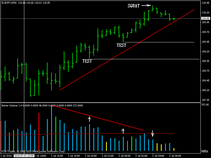 Hola, pues parece que el VSA dió larazón, ¿no?. Primero hizo un TEST que no me gustó. La siguiente barra apenas cerraba al mismo nivel, y en el mínimo de su rango. Además el volumen sube con respecto a las barras anteriores. PACIENCIA. Luego si llegó el TEST bueno. Poco volumen (menos que las dos anteriores), y con confirmación enla siguiente barra. Ahí entré, en 109,76 en largos. Después, y tras ver la entrada de volumen exagerada que ha habido, y que la barra ha cerrado de la mitad hacía abajo, me huele mal y me largo en el Doji en 110.44. Ya por hoy no hago más. Buen finde. Saludos