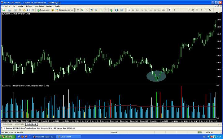 Hola jolodo, lo que indica el color de las barras está puesto en una sintésis que hice en un .doc en la primera página del hilo. Pero si controlas inglés, mejor leete el artículo original en pdf (está en el primer post) que no es muy extenso pero si dice más que yo. De momento me estoy entrenando con el volumen, y me va a llevar mucho tiempo...Es difícil, y también falla. Yo abro 3 espacios temporales, 30min, 5 min y 1min. Éste último es el que me hace tomar las decisiones de entrada al mercado. No utilizo más. El sistema de btoc de momento no lo he mirado, él estará probándolo, espero que de resultado. Adjunto un ejemplo de una entrada perfecta: - Barra blanca: Inicio o final de tendencias bajistas. En este caso, final, estamos en un suelo. - Barra verde : Agitación de volumen. Observar que poco rango tiene su vela, pero la cantidad de volumen que hay. El dinero inteligente está entrando...Y vuelve a repetir barra verde, se toman posiciones. Un trader arriesgado podría entrar aquí. -Barra roja : Inicio o final de tendencias alcistas. Yo no entro en esa barra, miro un poco que pasa luego y tomo la posición, largo en este caso. Estoy con cuenta demo. Espero que valga el ejemplo. Saludos, - "El conocimiento sólo se posee si se comparte"