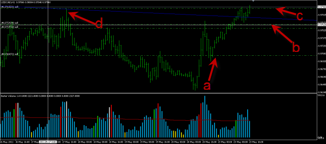 en las flechas A B C son entradas a corto en la flecha A fue la primera entrada, al parecer no era tiempo de entrar todavía en la flecha B puse otras 2 entradas a corto porque note que iba subiendo sin volumen y se iba acercando a la linea de tendencia en la flecha C fue la ultima entrada a corto aquí a reventado la linea de tendencia superior en muy poco volumen talves aquí en el punto C era la primera entrada a corto en el punto C es muy poco el volumen comparado en la resistencia de el punto D SALUDOS!!