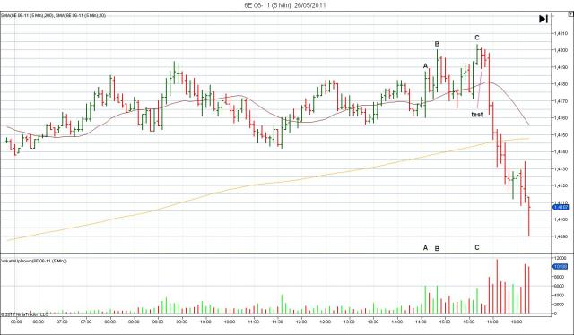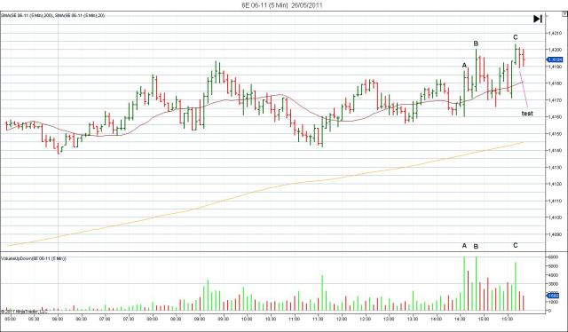 me alegra muchísimo ver que el tema que abrí hace tiempo, sigue estando vivo. Cuando uno decide emplearse a fondo en esto del trading, se te lleva tiempo y dinero, y no he podido contribuir desde hace tiempo a este hilo. Pero veo muy ilusionado que la gente sigue aquí manteniéndolo vivo y aprendiendo. Les voy a poner una entrada que hice el pasado jueves en el futuro del EUR/USD. La gráfica es la misma que en el forex normal, tan solo van unos ticks de diferencia. Verán como el dienro inteligente entró antes de la noticia, estando todo decidido minutos antes de la misma. La noticia (un dato importante que afectaba al dolar) se daría a las 15:55. -La barra A se produjo a las 14:45. Vean el amplio rango de la barra de precio y de volumen, y el resultado de la misma. Después de esa barra, tenemos una contestación bajista. -La barra B, a las 14:50, es una réplica exacta de la barra A. Vuelven a entrar ventas en el mercado. Mientras el mercado sigue con su tendencia alcista. -La barra C, a las 15:40, vuelve a entrar volumen alto, y el resultado de esa barra (la siguiente) es un test bar. -Pero es un test bar fallido, puesto que la barra de después también es bajista. Un tick por debajo del test, es la orden de venta que decidí poner. Este era el escenario Para cuándo se dió la noticia a las 15:55, el dinero inteligente ya había puesto sus posiciones vendedoras, el resto son los demás yendo hacía dónde va el mercado y otros muchos saltando sus stop loss. Y esto fue lo que pasó El volumen anticipa todo. Es dificil entenderlo, y sobre todo saber cuándo deja de entrar volumen comprador o vendedor. Hay que tener mucha paciencia. También es bueno trabajar con más de un espacio temporal, para cuándo como en este caso, se empiece a ver que la cosa va a girar en 5min, en 3 min podemos confirmar nuestro análisis. Un saludo "El conocimiento sólo se posee si se comparte"