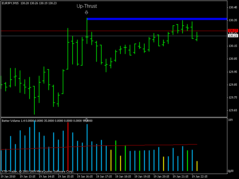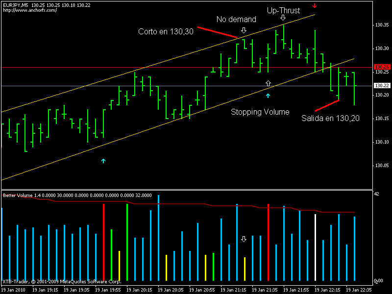 creo que el volumen que ofrece cada broker es la cantidad de movimientos que ese broker tiene en cuestión. Dependiendo de la cantidad de clientes que tenga cada broker, así se mostrará. El tema de los ticks puede ser valedero, pero ya se aleja de la teoría escrita por T. Williams y R.Wyckoff, en ningún momento hablan de ticks. ¿Cómo certificar que alguien gana dinero con este modo de operativa?. Por este medio (internet) es imposible. Estoy harto de ver pantallazos que pueden o no estar trucados, vete a saber. Yo mismo estoy dudando de poner uno, aunque lo voy a hacer ahora mismo, puesto que estaba en corto en el eur-jpy, y parece que ha salido bien mi análisis. ¡Ojo! lo hubise puesto aunqeu me hubiera confundido, quizá así podríamos ver dónde estaría el error de mi análisis. Pero ha salido bien. De hecho esperaba una caída al menos de la amplitud del canal, pero como ya estoy cansado, he decidio cerrar con tan solo 10 pips. ANÁLISIS. -Gráfico 15 min. Veo que ha habido una señal de venta importante, y que el mercado se ha ido abajo, pero ha recuperado. En esa recuperación, veo que se acerca al máximo alcanzado anteriormente, con la esperanza de que ese punto, vuelva a servir de reistencia, ya que no veo fortaleza en el mercado. -Gráfico 5 min. Siempre analizar primero desde una perpectiva global. Se observa que el precio tira hacia arriba, pero no le acompaña el volumen. ¿Quién sube el mercado entonces?. Las manos débiles. Primer símbolo de debilidad serio, el no demand. Ahi entro yo. Muy mal, precipitado, debería de esperar a ver que hace siempre la siguiente barra (ley de causa-efecto) pero como el gráfico de 15 min ya me estaba dando indicios bajistas... Las manos fuertes empujan el mercado hacía arriba. Es una trampa, quieren borrar cualquier intento de ventas que no sea el suyo. Si estás corto (como yo en ese momento) y el tirón es grande, o te salta el stop o te has quedado bloqueado. Yo aguanté bien el zarpazo, pues no es muy serio el repunte. Y la señal definitiva es el Up-Thrust. ¡Miren el volumen! Esos son los peces gordos, como en el Stopping, solo que el ambiente basjista decana al merado hacía abajo. Y muy importante, la barra de después de la señal. Después del Stopping, ¿quién tira hacia arriba del mercado? Poco volumen, no?.¿Y después del Up-Thrust? Ahí si hay volumen, no?. Espero que haya servido para aclarar mi tipo de operativa. SOY NOVEL en el VSA, pero creo que el análisis es correcto. Saludos, "El conocimiento sólo se posee si se comparte"