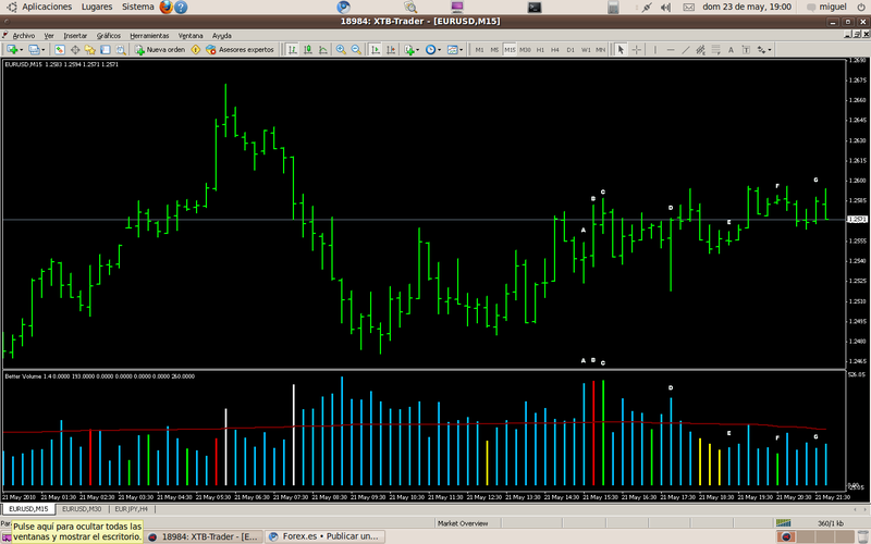 gracias por tus comentarios ti_men. No te preocupes por revivir el hilo. Yo abrí el mismo, y solo lo miro cuándo alguien ha hecho un comentario, ya que como sabes, llega un aviso al correo. El hilo no va por dos motivos: 1. La gente no cree en este tipo de operativa. 2. A al gente le funciona, y ya no anda perdiendo tiempo por los foros. Imagino que será la primera opción. No me importa. El hilo le abrí con la intención de que dentro del grupo de hispano-parlantes se conociese dicha operativa. Si has leído mis post, nunca pretendo demostrar ni criticar nada a nadie. No daré pantallazos de lo bien o lo mal que va mi cuenta. Esto es VSA, una de la más antiguas formas de operar. Y funciona. Solo con coger un gráfico, y conocer y aprender los patrones de esta operativa, el analista puede ver facilmente como se cumplen los patrones en más de un 90% de las veces. Aquí solo intervienen dos parámetros, precio y volumen. ¿A caso hay más en los mercados?. NO. El amigo chuyito se ha puesto bien al día, hace tiempo que no se sabe de él. Creo que él si está dentro de los del grupo 2. Qué más puedo decir...¿Una predicción quizás?. Bueno, pues allá va: Vivo en España, así que hoy es domingo 23 de mayo. Son las 19h. El forex está cerrado. Así no podrán decirme que si la imgen está trucada y demás. Luego se mirá la hora en la que lance el post y verán que es legal. Esto es arriesgado puesto que como dice el libro de "Trading en la zona", cada momento es único, y lo que a mi me parezca ahora, puede cambiar en 1 minuto cuánda abra el mercado. Empiezo: EURUSD 15 min. A. Ultra volumen. Cierre un poquito por encima de la mitad. Me indica que no es alcista pruro, es decir, que hay ventas dentro de esa barra. B. Ultra volumen (más que el anterior). Tampoco es puro alcista, pero si es el resultado de la barra anterior. La cosa va de compras. C. Ultra volumen (el mayor de los tres). Sigue sin ser puro. También el cierre es mayor que el anterior; pero ahora mirén dónde cierra la barra siguiente a C. Bajista cerrando al mínimo. Ha habido ventas, y creo que bastantes. D. Stopping volumen. Barra amplia, marca un mínimo y cierra en su máximo. Volumen alto también. Clara señal alcista, pero vamos otra vez al resultado (siempre tan importante). La barra siguiente No es capáz de cerrar por encima del cierre anterior. Hay debilidad en la tendencia alcista. E. No hay demanda. Rango estrecho, barra que intenta con cierre superior a la anterior, con volumen inferior a las dos anteriores, que da como resultado que la barra siguiente cierre por debajo de la misma. Debilidad. F. Barra estrecha, con menos volumen que las dos anteriores. Es parecida a la E pero tiene algo de especial. Tiene más volumen. Hay "agitación" de voluemen. La siguiente, también cierre por debajo de F. Aquí creo que han entrado ventas por un tubo. G. Aquí es una vuelta en V. Un giro de mercado. Así cerro el viernes. No creo que vaya a girarse ahí precisamente. Yo entiendo que la tendencia es alcista, pero que ha dado signos de debilidad ya importantes. Las barras A, B y C son dónde ha entrado la pasta. Y son todas alcistas y cerrando siempre una mayor que la otra. Hay muchas compras en esa zona, pero no son puras. Entiendo que el mercado escalará algo más. Quizá hasta los 1.2673 , que es el máximo anterior, o incluso hará un máximo nuevo, pero no muy lejano. Me faltan barras. Hay que esperar un signo fuerte de debilidad, como un No demand con volumen muy bajo o un Up-thrust, y ahí entrar en cortos. Pero la DEBILIDAD, está servida. Veremos que sucede esta noche. Bueno, yo lo veré mañana por la mañana, que dormir es lo primero Un saludo "El conocimiento sólo se posee si se comparte"
