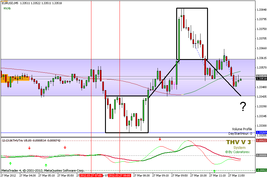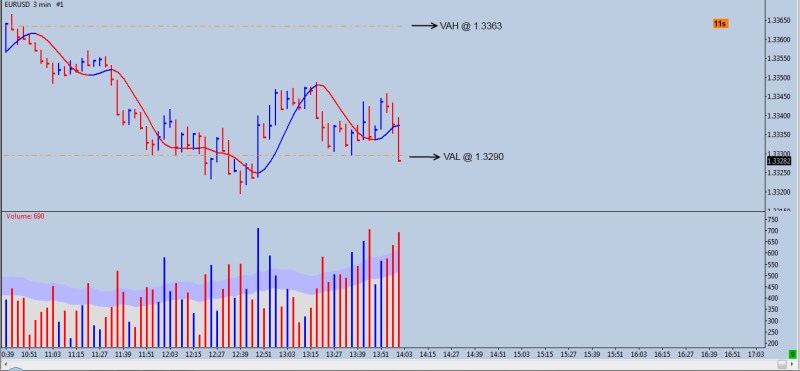 En mi caso he probado con el 70% como marcan los que usan MP, pero he visto que con un 85% se ajusta mejor los maximos y minimos diarios y con ello tengo un punto de partida para saber si los pro van a romperlos en funcion de VSA. Viendo tus graficos tenemos una diferencia de unos 10 pips seguramente porque tu estas aplicando el 70% para la creacion de tu VA. Hoy se dio lo que comentaba en mi otro post, volvio al VAL del dia de ayer y reboto llegando unos 20 pips por arriba del VAH de la sesion. Luego en la sesion EU volvio a tocar el VAL diario (un doble suelo). Yo fui a largo en 1.33250 y sali antes de las noticias con unos pips de ganancia. En estos momentos estoy viendo como se comporta 1.333/1.332 para volver a entrar. Si no he sido claro, me avisas y me esmero un poco mas Saludos, Bernardo.