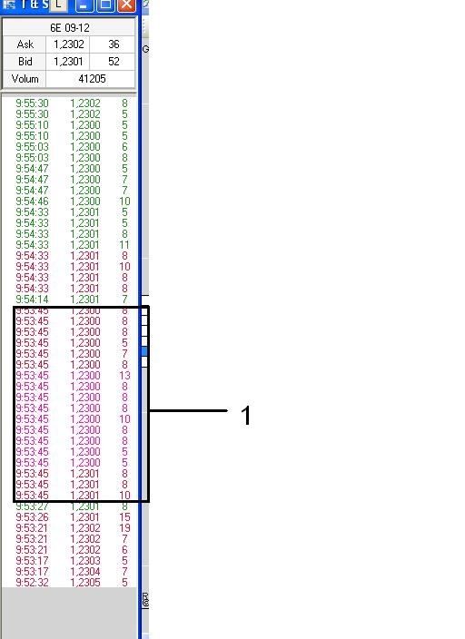 Mira, veis estas secuencias que he marcado de ahora mismo, es lo que alude el articulo de supperia, son los cruces buy limits del Dom con los sell markets. En este caso supongamos que un individuo o institucion X, lanzó 400 contratos los cuales se ejecutaron en los diferentes bloques que se ven en el cuadro. Esta mañana esto está muertísimo pero perfectamente puedes ver bloques de 20,20,20,20 o 40,30,35,50 etc... es decir, hace falta colchón y potente para ejecutar este tipo de operaciones asumiendo garantías y demás parafernalia. Mientras esto siga siendo así asumo que hay gente especializada detrás y por tanto analizo sus huellas a mi manera con aceptables expectativas. A lo mejor sólo pienso yo así, pero el mercado futuros me parece mucho más transparente, fiable ...en definitiva es más profesional, las plataformas, las posibilidades en cuanto a programación, prácticamente todo es mejor sólo que más caro ![]() Para lo que es ideal el spot es para probar los nuevos robots en microcuentas y no perder muhco dinero en los períodos beta saludos