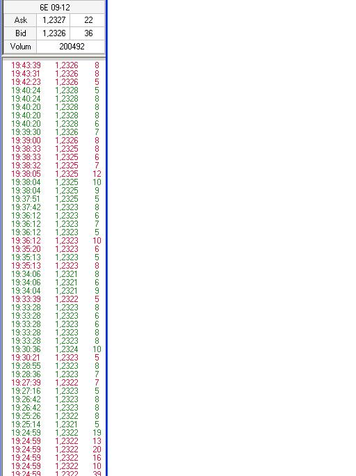 Si son lotes lo que se printa en la cinta, en los futuros la unidad minima de negociacion es un contrato o lote supongo que se podrá llamar, donde el valor de este no siempre es el mismo para todos los activos.   En cuanto a lo que comentabas J, ese es el tema yo de verdad que no opero futuros solo analizo, pero el contratos grande a penas sufre deslizamiento según tengo entendido, si te pasas a los micro es posible que en determinados momentos las ordenes se te quedan colgadas, la verdad que no lo se pero eso de que el mejor precio te lo da el spot antes que el futuro que estaríamos hablando de 1 tick a lo sumo?? lo que si es verdad que la cotizacion es de 4 decimales así que si el spot te ejecuta en 1.2251, 2252,2253 etc... el futuro lo haría en su equivalente en ese momento por ejemplo 2264 asumiendo el actual diferencial de 13 ticks. El caso es que ninja asigna un color a esos prints. La metodólogia que usa no la recuerdo pero la puedo buscar de nuevo y les cuento, con esto se forman las barras opacas de los clásicos indicadores de volumen o se "ordena el flujo de contratos" para una mejor visualización.  como se ve en la imagen lo que lleva de día se han cruzado unos 200 k contratos por lo que ha sido una jornada bastante light. Para estimar si son estaciones de acumulación o distribución habría que estudiar los grupos de prints que ninja asigna al flujo de su fuente de datos. En este caso si volveríamos a darle importancia a la calidad de la fuente. Creo haber leído que cuanto más lejos de la matriz de chicago peores son ademas de las técnicas usadas. Lo que a mi no me convence nada es decir que es acumulación o distribución porque unas barras opacas se amplían en determinadas zonas del gráfico ya igual puede ser acumulación que distribución que reacumulacion o redistribución o lo que quiera que estén haciendo, no se si me expliqué. el 99 % de las estrategias en la actualidad son estrategias de reaccion ,es decir operas basado en lo que ya paso y la acumulacion es una estrategia de accion ,es decir que te adelantas a lo que va a pasar y acumulas ,,si lo haces como los ricos necesitas de un camion de dinero ,pero si aprendes como trabaja ,te aprovechas de lo que esta haciendo el millonarios ,,hay informacion que apoya todo lo que e dicho,,si la encuentras te forras y lo mejor es que no necesitas estar todo el tiempo frente a la computadora