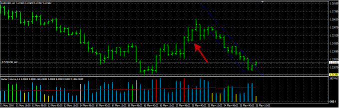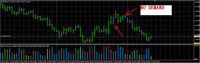 Re: VSA (Volume Spread Analysis), el Volumen siempre cuenta.solo para preguntarte corcha si aqui donde esta la flecha era una señal de entrada en venta....porque tiene poco volumen y que significa que no va a llegar muy lejos arriba.