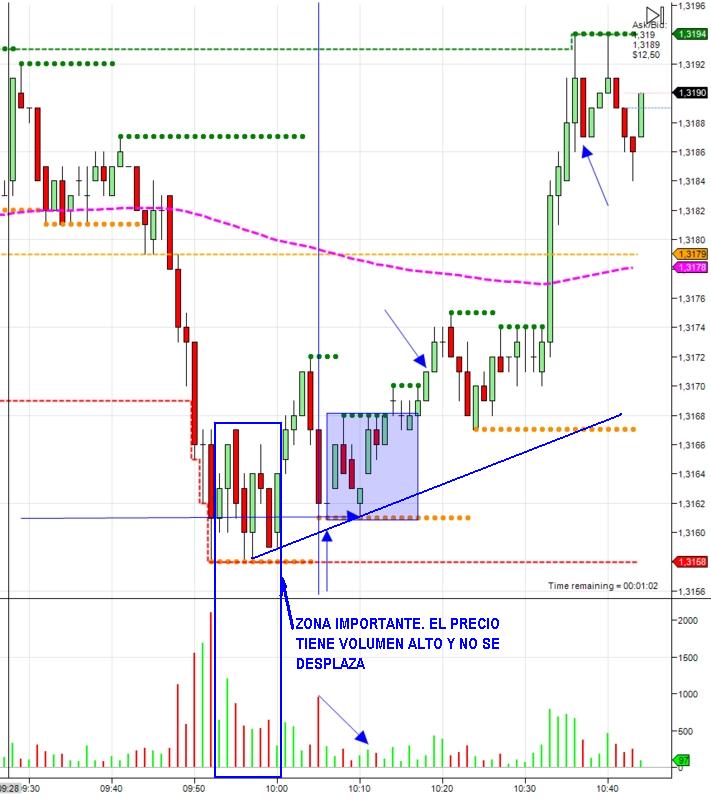 Corcha: 1- Esta mañana acabo de realizar un analisis en 1 minuto del E6 y la verdad me fue bien, no se si es suerte jeje. ¿Suele dar varias entradas en TF tan bajos? 2- La verdad me interesa mucho el tema del E7 y este sistema. Actualmente opero el futuro del oro y la verdad voy muy apalancado. Mi idea es cambiar a productos menos apalancados mientras cojo soltura con este sistema (que me parece lo mas fiable) y voy dejando de lado mi forma actual de operar. ¿En todos los futuros el volumen del futuro "grande" es valido para el mini? 3- Yo opero con mirus y ninja. Pero me interesa tambien poder aplicarlo a forex y creo que con el futuro del par se puede dar bien 4- En eso me alegro. Porque sinceramente no soy partidario de los indicadores. Me inclino mas por el PA y el tema de volumen me ha chocado. Creo que se le puede sacar mucho partido combinando ambos. Lo unico que no veo claro del todo es como calcular el riesgo antes de entrar porque tampoco se predice hasta donde puede llegar el precio y creo que eso es importante. Bertdf: Muchas gracias por la info y la perspectiva. Me ayuda mucho a ver que esto es posible jeje. ¿que sentido tiene el indicador de soportes y resistencias en funcion del volumen? La verdad es la primera vez que lo veo y me resulta curioso. ¿como lo aplicas? voy a dedicar tiempo a estudiar la forma que tiene de operar y te comento si me surge alguna duda o sugerencia. ferxf: Somos compañeros en otro foro aunque yo tengo otro nick alli. Espero leerte mucho Gracias a todos! -------------------------------- Me surgen algunas dudas con este sistema. ¿Creeis que es necesarios prestar atencion a tendencias en TF mayores? Lo digo porque si el volumen no esta indicando en cualquier Tf un posible cambio en principio da igual la tendencia ya que se trata de eso... de pillar tendencias. ¿no? jeje. Por lo tanto la multitemporalidad tampoco tendria mucho sentido utilizando VSA.