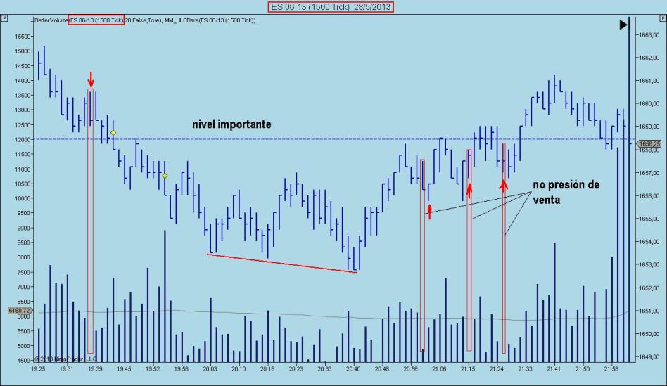 Buenos días, Cómo parece que esto está un poco paradillo, vamos a ver si animamos el cotarro. Voy a introducir algo nuevo para el hilo, algo de lo que creo no se ha escrito. He tenido la suerte de poder hablar con un trader de los buenos, de los que invierten en real y logran a final de cada semana batir al mercado. Me dijo que le explicase mi sistema, y yo explique todo el tema del VSA. Le pareció magnífico. Él también solo utiliza la acción del precio. El volumen sólo lo ve a modo de velocidad. Dependiendo de la velocidad con la que entra el volumen, pues se preveía una cosa u otra. Tenía un indicador diseñado para ello. Esta persona se ha tirado varios años en Nueva York, y allí se formó como trader. Al grano. Al enseñarle mi espacio de trabajo, me dijo que cómo no operaba en ticks. Decía que no conocía a nadie que viviese de esto que operase en espacios temporales. Quizá exageró, o verdaderamente no conocía a nadie. Yo si conozco a dos que operan igual que yo (mejor dicho yo igual que ellos) y si viven del trading. Cada uno tiene su círculo de amistades, y en esto nadie tiene la verdad absoluta. Comencé a buscar por la red. Ya estaréis buscando alguno en estos momentos je je. Google arroja resultados como “el mejor secreto guardado por los profesionales” “ Ticks Vs tiempo” etc. Yo llevo 1 mes probando. Me está costando acostumbrarme, pero si creo que se le puede sacar más ventaja que a los 3min, 5min …etc. El volumen se ve peor, pero ajustando la escala lo dejas igual que en timeframes de tiempo, con la ventaja de que también aprecias mejor esa “velocidad” de entrada de volumen. También os recomiendo busquéis el número de ticks acorde a vuestro producto, ya que si lo bajas mucho aquello corre que no te da tiempo ni a poner las ordenes. Yo para el mini s&p utilizo 4500, 1500 y 500 ticks. Os dejo una imagen. Saludos.