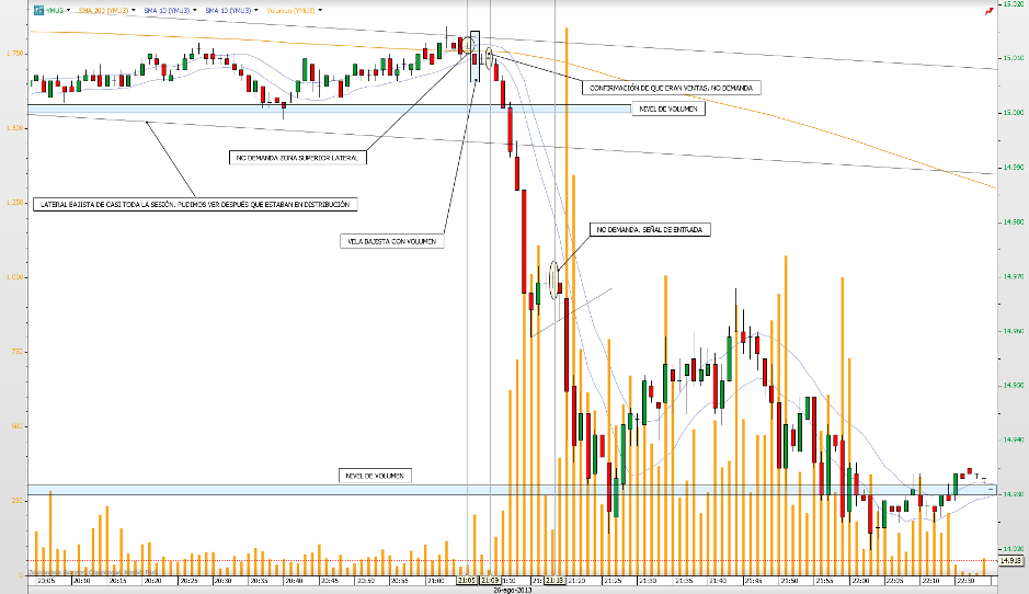 Después de un lateral bajista para aburrirnos a todos, le metieron un buen tirón para abajo con alguna señal muy muy interesante. Para mi la entrada más clara es en la no demanda que tenemos después de la primera corrección. Lo estuve siguiendo en real y me pareció muy interesante. (se te ponen los dientes largo por no haber entrado).