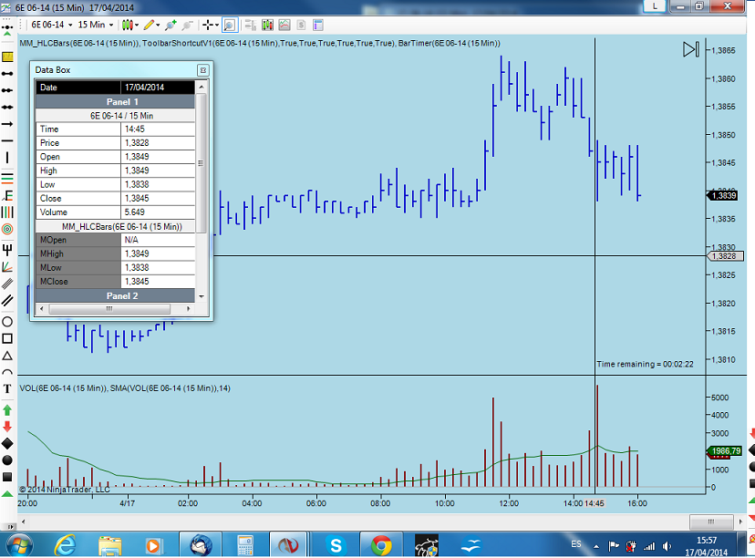 aspecto del futuro del euro plataforma Ninjatrader, broker AMP. Compara el volumen con el de tu broker. "El conocimiento sólo se posee si se comparte"