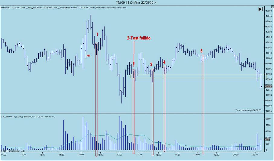 He encontrado estos que vi en la sesión del viernes en el futruo del Dow. 1. Cumple con la teoría. Tiene cola inferior, cierra en la mitad, y volumen bajo. Además se produjo en el Fibo 62. Siguiente barra confirma. Buena entrada. 2. Primer testeo a la zona del 85/90. El test falla porque la siguiente barra es bajista. Y aunque sale hacía arriba, después vuelve. 3. El volumen de este es igual o inferior al del número 2. El test tiene cola, pero su cierre es mayor que el anterior. Otra variante. 4. Iguales características que el 1 y 2. Ya el volumen es más bajo (la oferta se a retirado) la siguiente confirma, y sale hacía arriba. 5. En este tengo mis dudas. La siguiente cierra al mismo nivel, el vol es bajo...No se si considerarlo como test. No se, pero me da que encontrar 9 tipos de test va a ser difícil. Realmente aquí han salido solo 2 tipos. Saludos, "El conocimiento sólo se posee si se comparte"