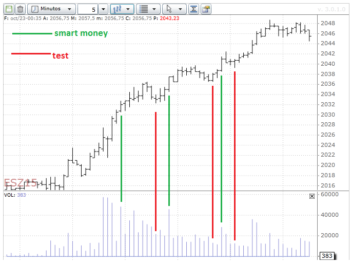Gracias por tus palabras. El hilo no puedo alimentarlo mucho por falta de tiempo, pero por supuesto cuándo la gente pregunta algo, dentro de mis conocimientos le contesto. Tengo proyectos como hacer un blog, o una web, pero se que no voy a poder comprometerme a tenerlo al día, así que mi personalidad me dice, si no hay compromiso, no te metas. En cuándo a lo del Test, entiendes bien, muy bien diría yo. El Test y la No Supply son muy parecidos. La principal diferencia es que el Test hace eso, TESTEAR OFERTA. La No Supply (no oferta) es que ya no hay por el momento, y sin embargo el Test van a “mirar” si hay o no hay vendedores. De ahí que muchas zonas se ven dos o tres Test. Me rio cuando me expones tu duda del Test de demanda. Esa pregunta me la hice yo también en su día. Según los libros, no existe. Según mi experiencia, si, solo que la llamaron Upthrust o No demand, también tal como tu interpretas. Para aclarar un poco más el tema del Test, pongo el gráfico de abajo. Sesión de ayer 22/10/2015 totalmente alcista en el futuro del mini SP. Quiero recalcar aquí qué es lo que se testea. Como se ve, las líneas verdes que he dibujado, corresponden a volúmenes altos, donde el profesional ha entrado. A parte del volumen alto, al barra de precio se desplazará, será de rango amplio. Uno con línea roja el test. Cumple parámetros: Barras rango estrecho, poco volumen, cierres de la mitad hacia arriba. Fíjate que la zona donde se producen los test, es la zona dónde el Smart money actuó (más o menos), y como el volumen baja, indicándonos que la oferta ha desaparecido, y confirmando con la siguiente barra alcista. Espero que haya quedado un poco más claro. Saludos, "El conocimiento sólo se posee si se comparte"
