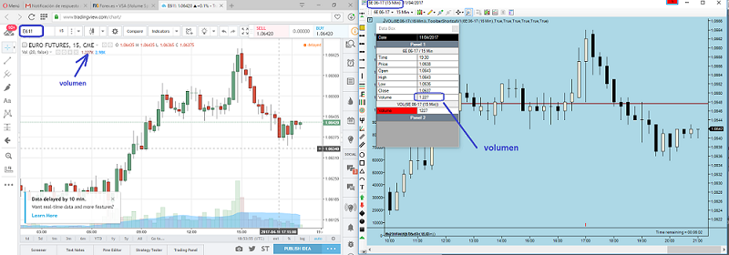 En el link que tu pones sale el volumen de FXCM, un broker, y por tanto te ofrece el volumen del broker. Si quieres hacer divisas y quieres volumen real, tienes que buscar el futuro del euro. Busca ahí mismo esto: E61! Lo he coprobado con mi plataforma y es clavado. Saludos "El conocimiento sólo se posee si se comparte"