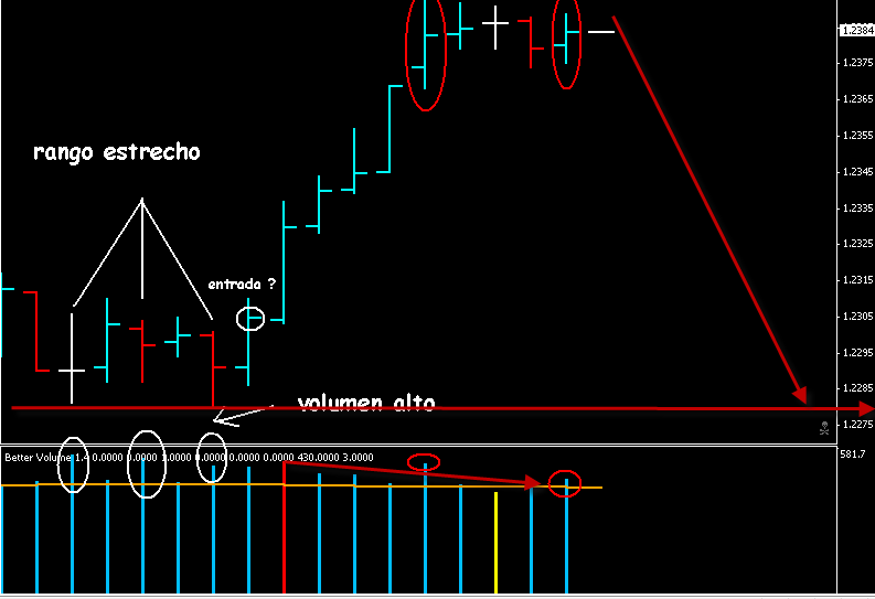 Re: VSA (Volume Spread Analysis), el Volumen siempre cuenta.miren el volumen cuando el precio ba parriba, el volumen se disminuye, aqui quiere desir que el movimiento no llegara muy lejos... y