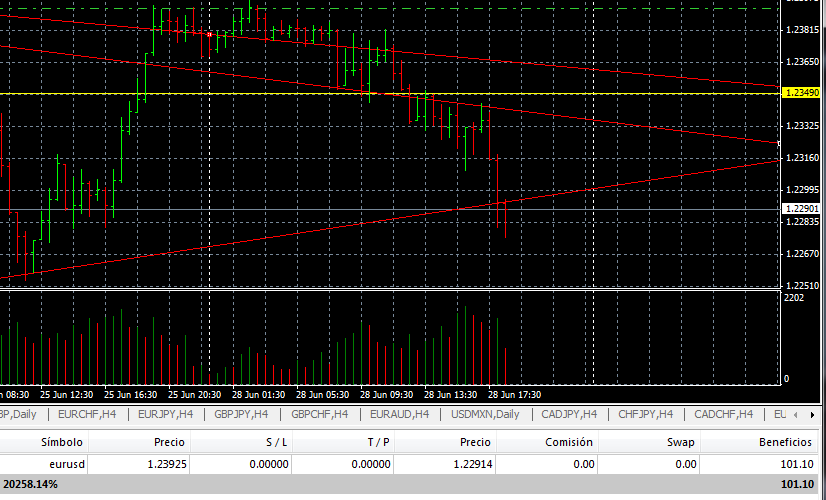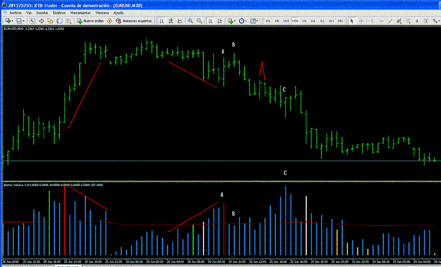 Siento la tardanza. Hay días que no puedo ni acercarme al pc por falta de tiempo. Comentaré, aunque ya tarde, el tema del EURUSD, bajo mi punto de vista, que es tan valedero o erróneo como el de cualquier otro forista. Todo el que se moja, se puede confundir. Lo importante es que el número de aciertos sea mayor al de fallos. El entorno general el día 25/06 es un Mark-up. El dinero de los poderosos marcan el techo de manera rápida y abrupta. Se cargan a todos los pobrecitos que andaban pensando ya en el giro de mercado, y ya estaban en corto. Ahí aprovechan para vender. El día 28 la disminución de volumen es significativa. El smart Money no esta interesado en esos niveles. El precio va declinando y el volumen aumenta (como bien comentaba ti_men) metiendo ventas en cada barra. A. Comienza el baile. Esa barra que a priori parece un Stopping Volume, pero es una trampa. Ni cierra puro en su máximo, y sobre todo y esto es lo que da la pista, la siguiente barra cierra apenas más alta que la barra A. Si hubiese habido más compras, ¿no creéis que la siguiente barra sería más amplia y cerraría bastante más alta?. B. Barra con menos volumen que las dos anteriores, y cerrando por debajo de la mitad. No hay presión de compras. Siguiente barra confirma esto. Después hay una vuelta en V invertida, también confirmada. Ese sería la entrada en cortos bajo mi punto de vista. C. Otro Stopping Volume, pero también falso. Ese si cierra en sus máximos pero, ¿cómo es la barra siguiente?. No tira hacía arriba. El precio sigue su curso. Saludos y gracias a todos por estar aquí aportando. "El conocimiento sólo se posee si se comparte"