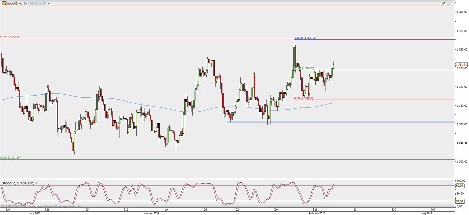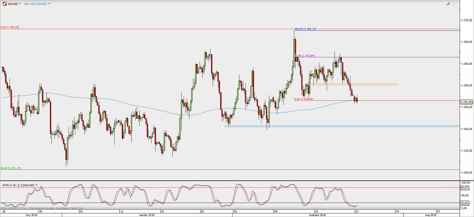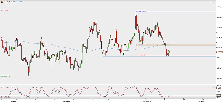 El oro se ha recuperado del soporte a 1320 USD, donde están los niveles del 29 de marzo y 6 de abril. El lado alcista está tratando de borrar parte de la última bajada, pero hasta ahora no es un movimiento más fuerte. La resistencia a la corrección potencial está en 1332 USD, es decir, el mínimo del 12 de abril, la rotrua del promedio móvil de 200 períodos y el retroceso de Fibonacci del 23,6%. en 1320 USD abrirá la ruta a 1300 USD (el nivel desde el 1 de marzo y retroceso de Fibonacci del 50%).